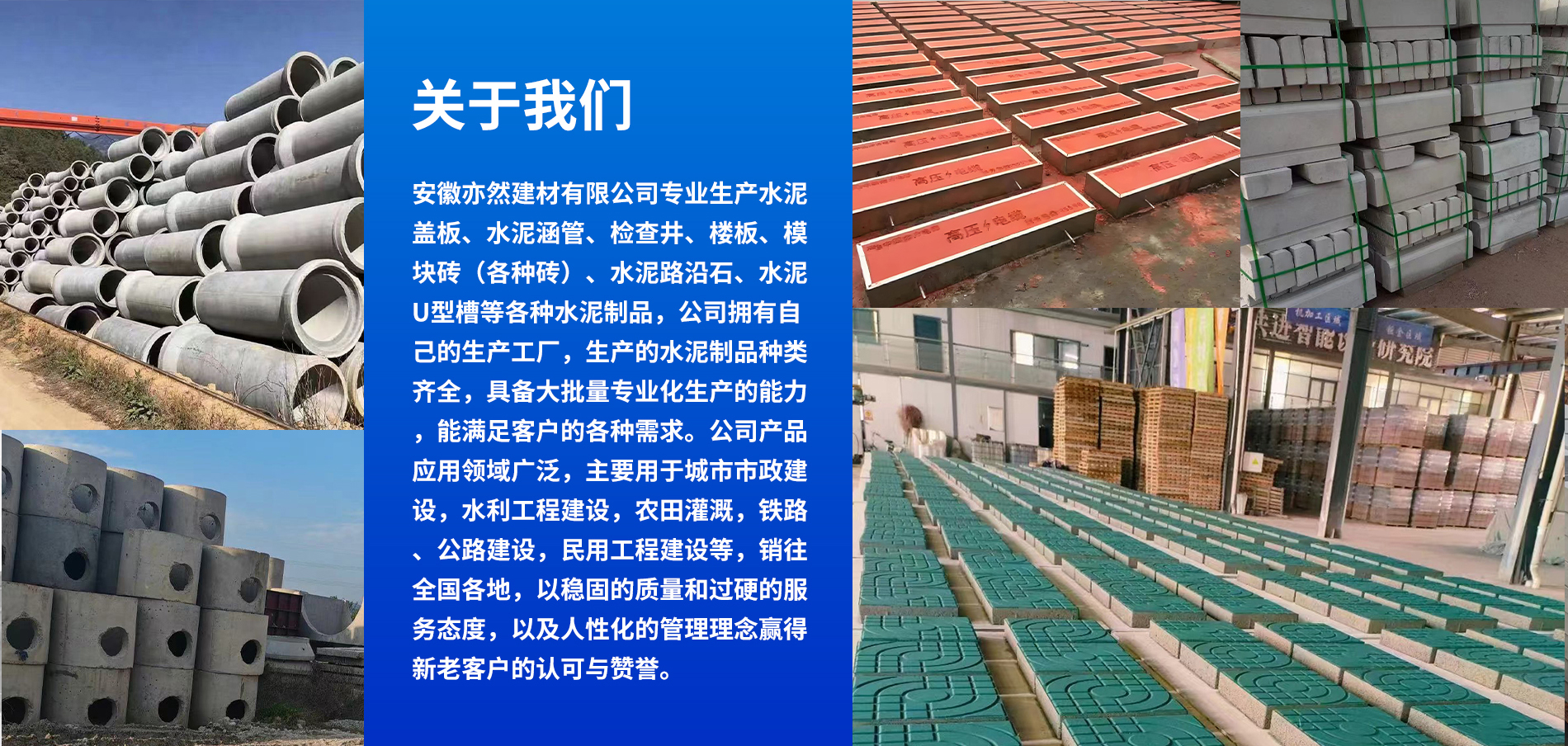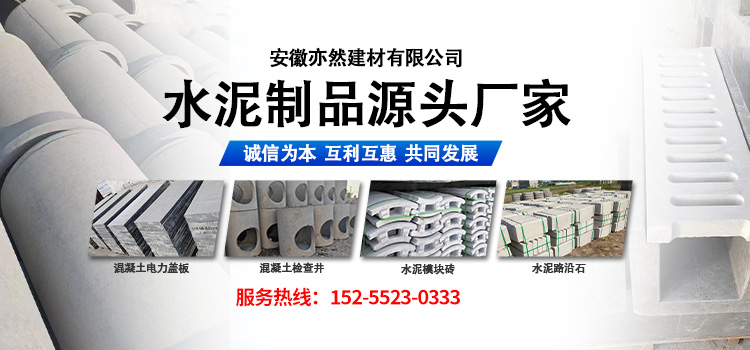 安徽亦然建材有限公司專業生產水泥涵管、水泥蓋板、檢查井、路沿石、水泥U型槽等各種水泥制品,公司技術先進,能設計、生產各種規格、型號的水泥制品,按需定制,滿足客戶需求,公司實力雄厚,加工設備齊全。